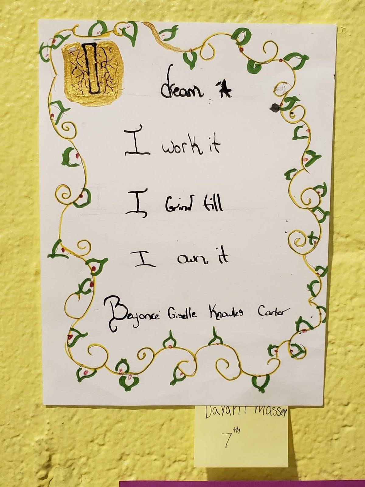 This was certainly one of the more complicated and labor intensive lessons we tackled this year. Student in 5th - 8th grade were first taught the basics of calligraphy writing, and then discussed the history behind illuminated manuscripts and the need to preserve knowledge, religious text, and history using only the written word. Students were then asked to bring in a meaningful quote or write one themselves, and create an illuminated manuscript from that work.